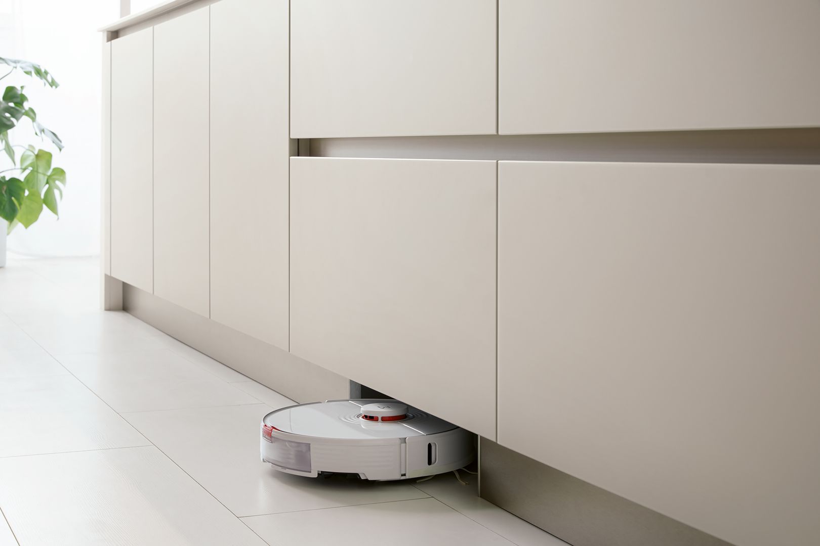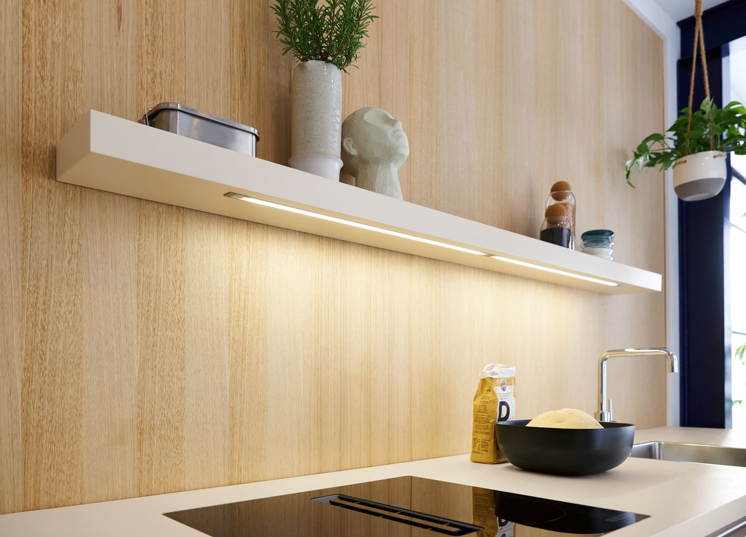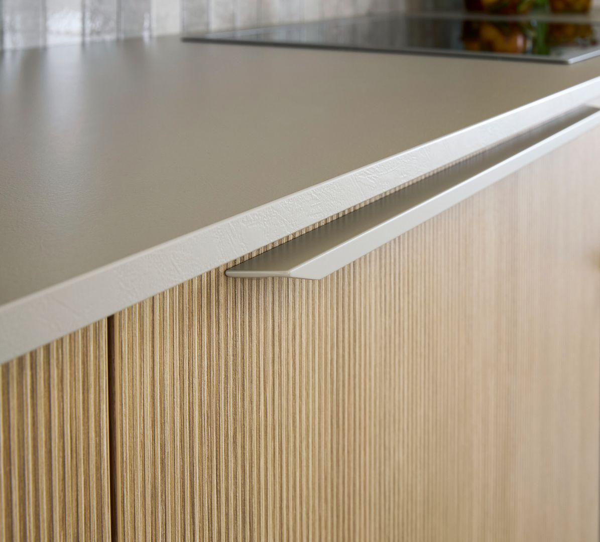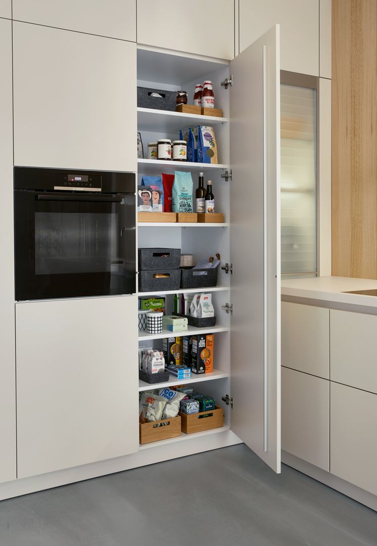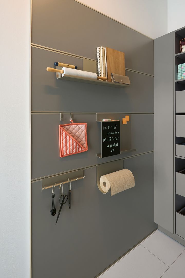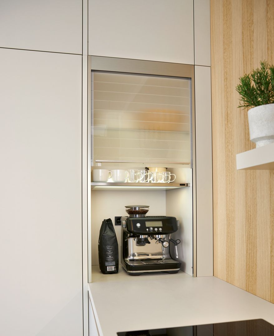 Klar und reduziert: Die muschelweißen Fronten zeichnen in Kombination mit der gleichfarbigen Arbeitsplatte ein einheitliches, in sich stimmiges Bild. Unterstützt wird dieser Eindruck noch vom neuen Griffsystem SingleX, das lediglich über eine Griffmulde direkt unter der Arbeitsplatte verfügt sowie der deckenhohen Planung. So entsteht ein Eindruck vollendeter Zurückhaltung, der dennoch ästhetisch zu überzeugen weiß. Als optisches Highlight, bricht der Jalousien-Schrank mit dem durchgängigen Frontenbild. Innerhalb der Schübe verbirgt sich die funktionale Zargenauflage, die den verfügbaren Stauraum auf zwei verschiedenen Höhen nutzbar macht.