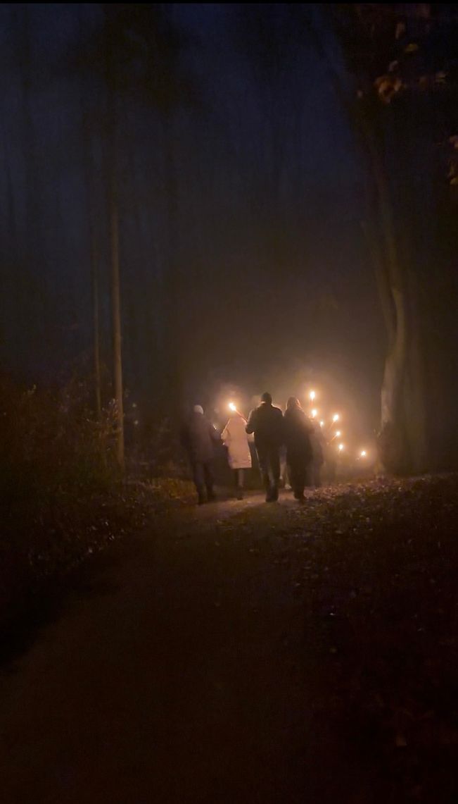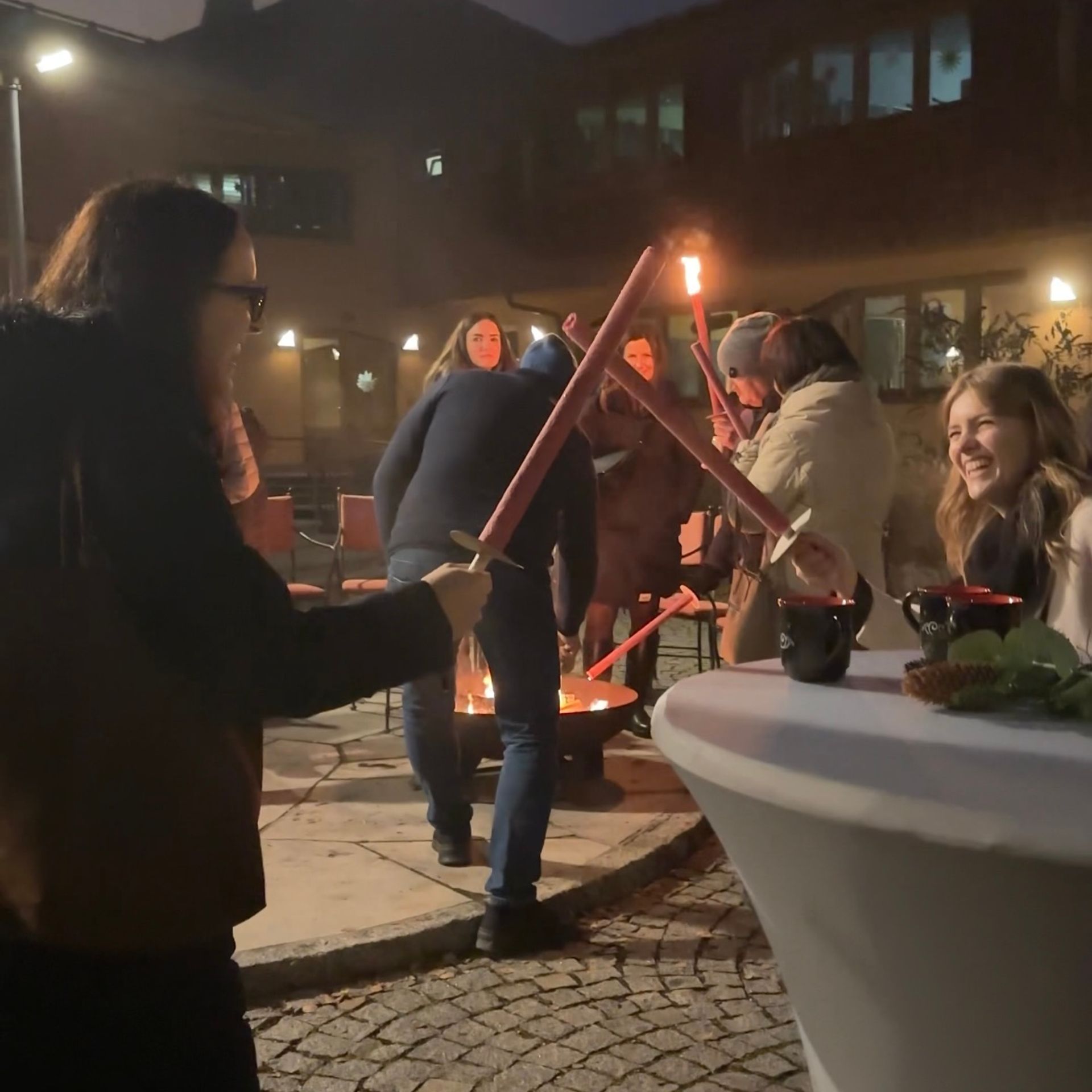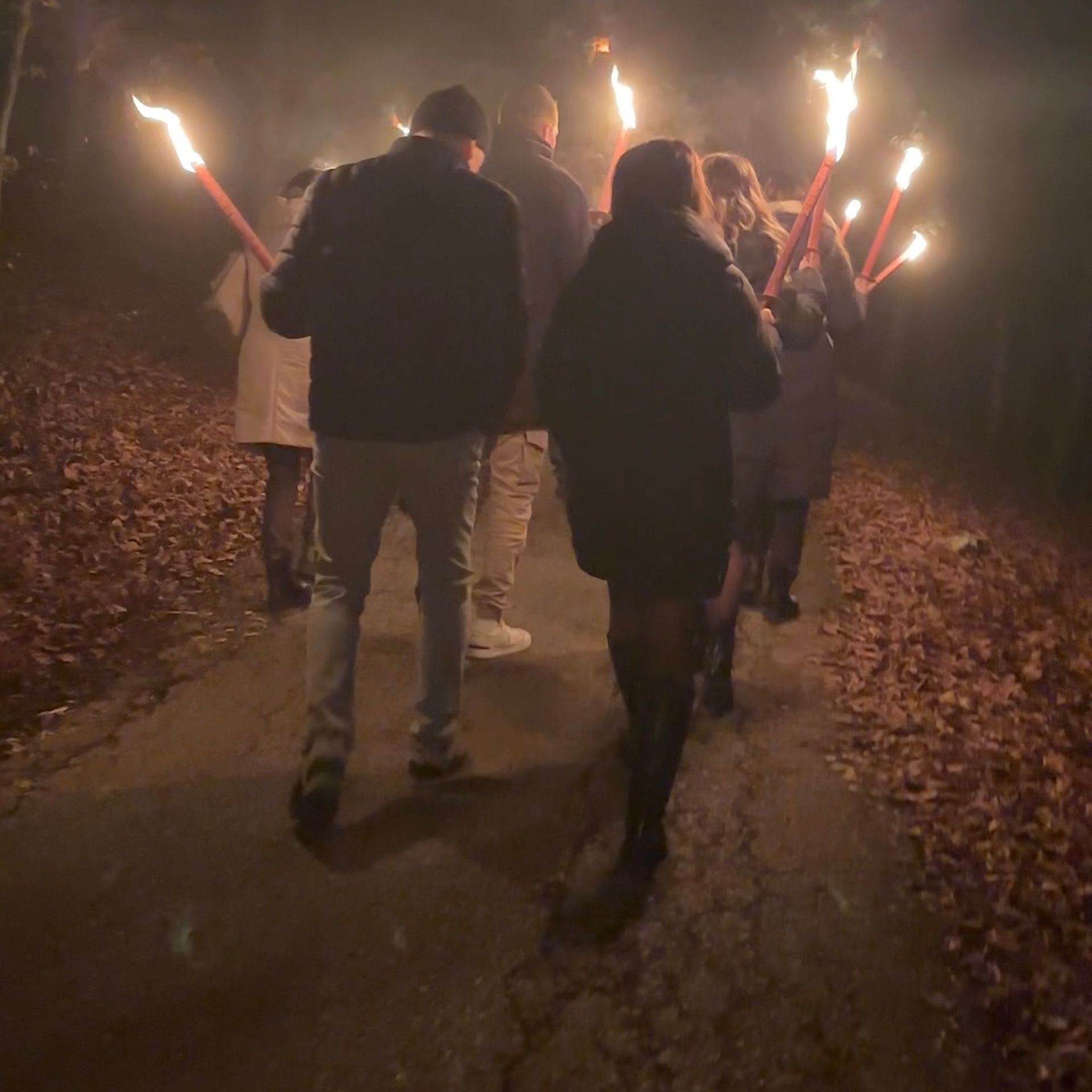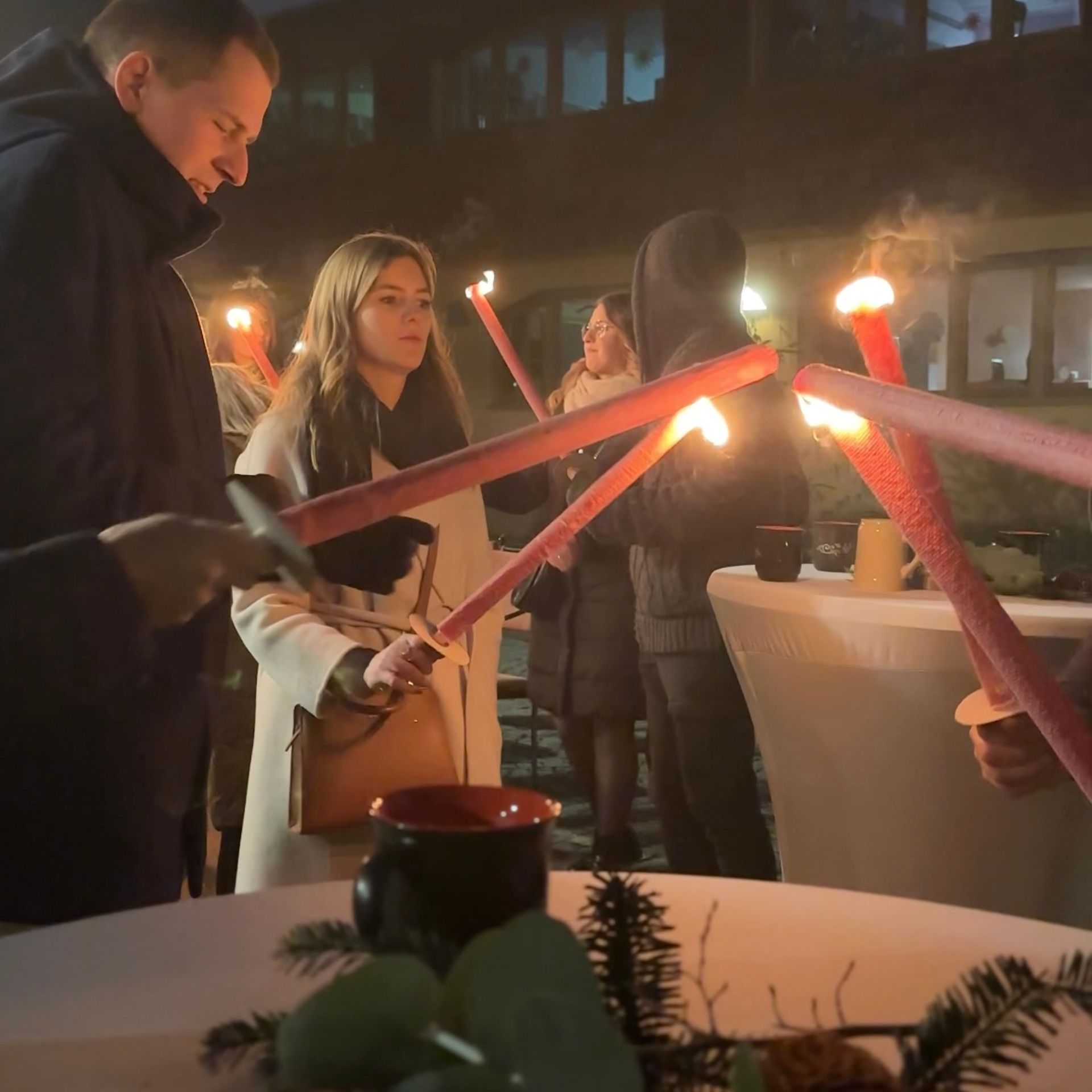 Mit dem Bus ging es weiter zum Schützenwirt in St. Jakob am Thurn. Dort erwartete uns ein herzlicher Empfang am Lagerfeuer – mit wärmendem Punsch und Welcome-Drink. Ein echtes Highlight: die stimmungsvolle Fackelwanderung, die dem Abend dieses ganz besondere Etwas verliehen hat.