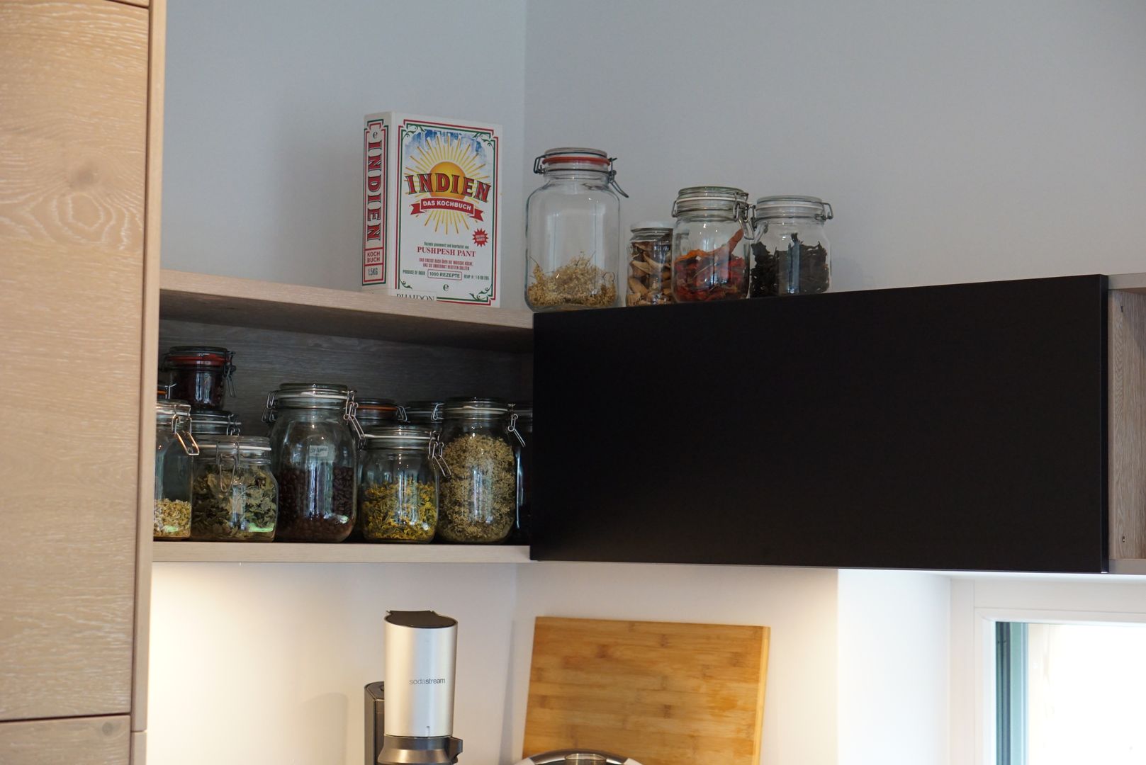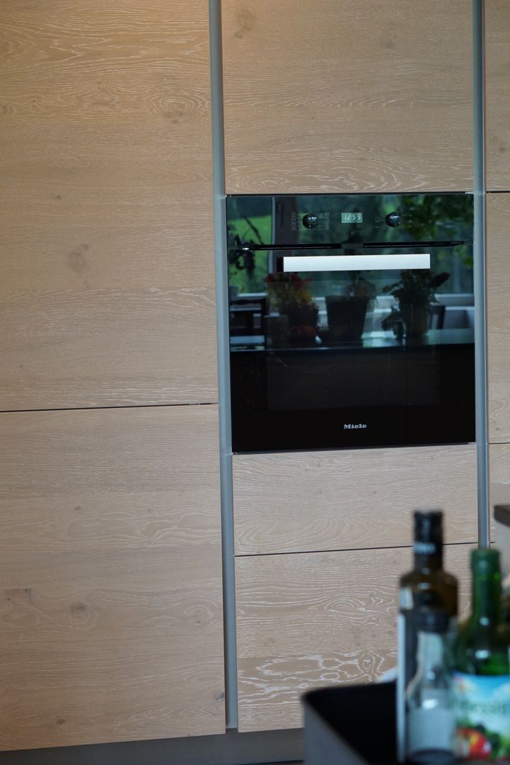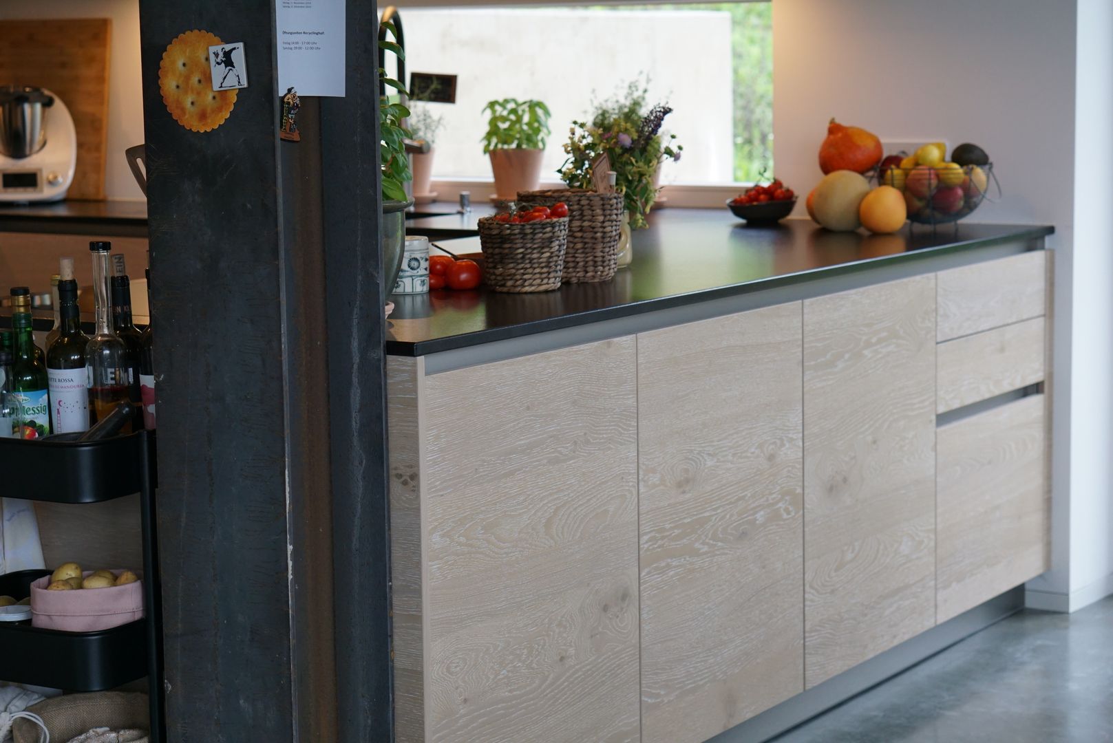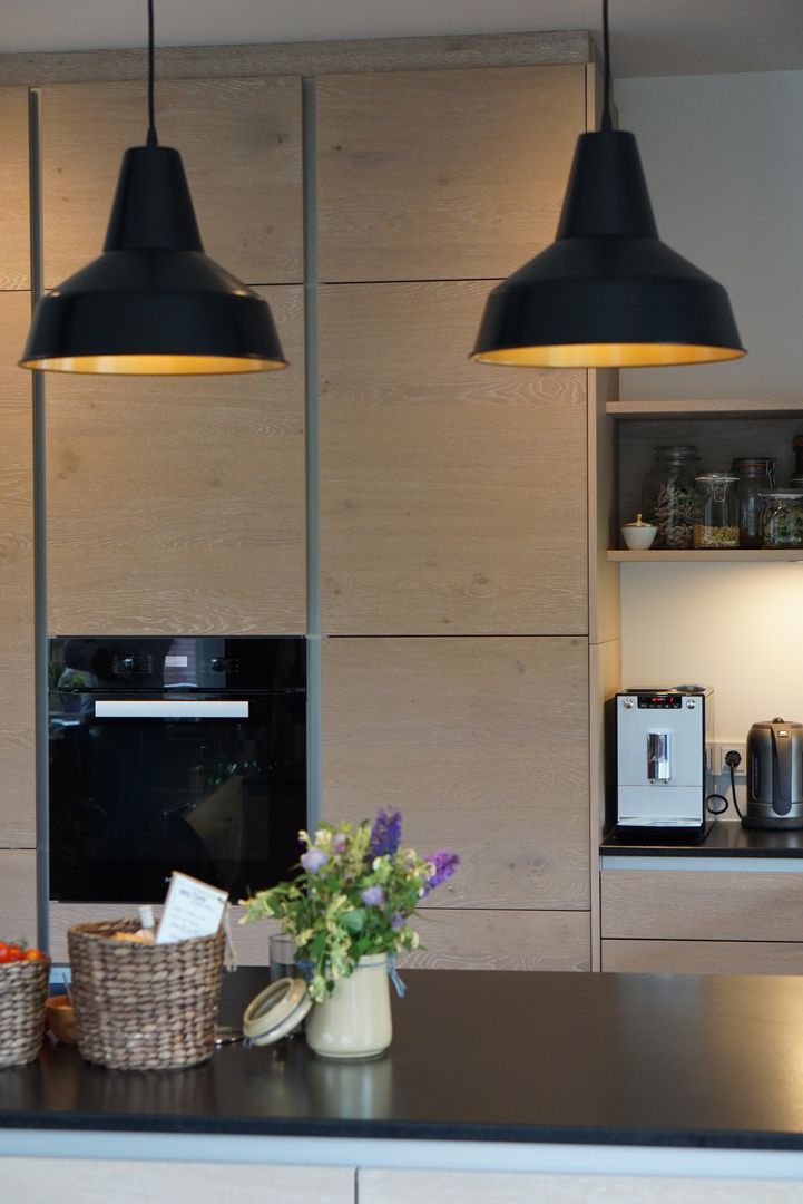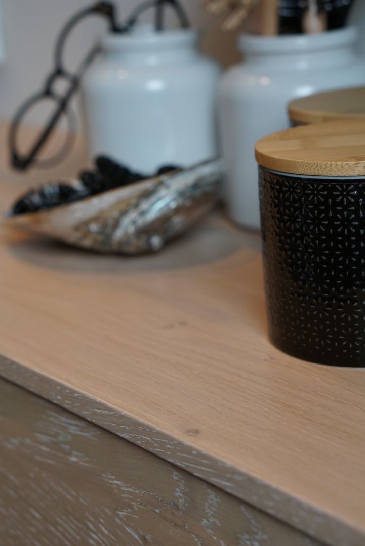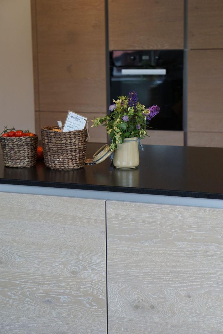 Eiche weiß gekalkt, kombiniert mit einer dunklen Naturstein-Arbeitsplatte
