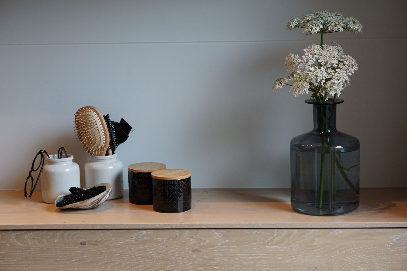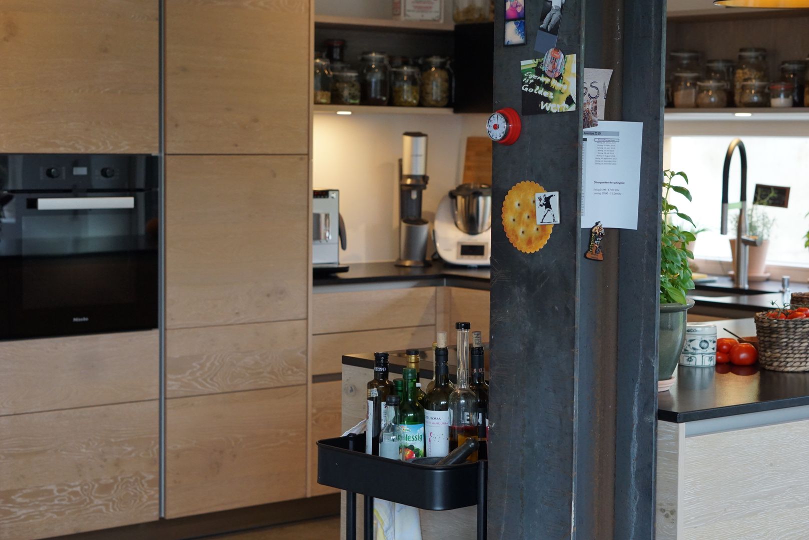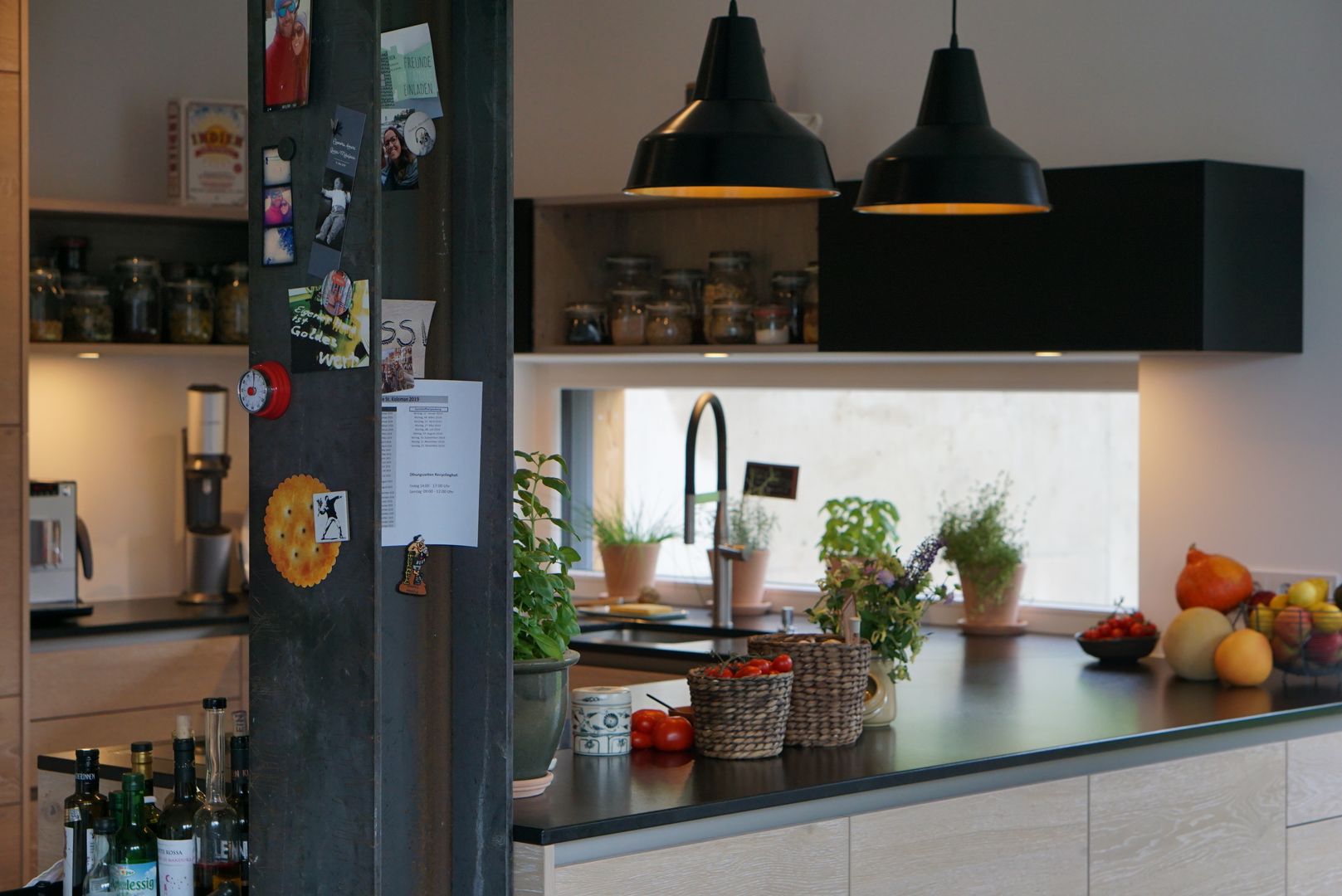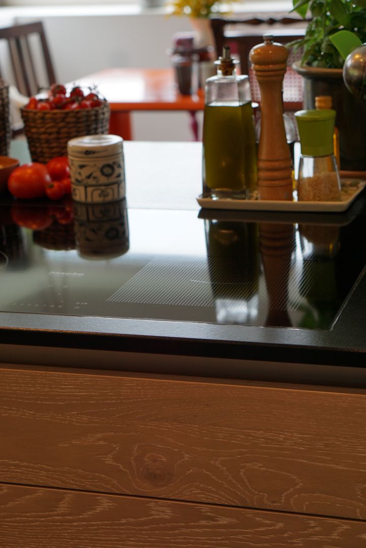 Eiche weiß gekalkt, kombiniert mit einer dunklen Naturstein-Arbeitsplatte