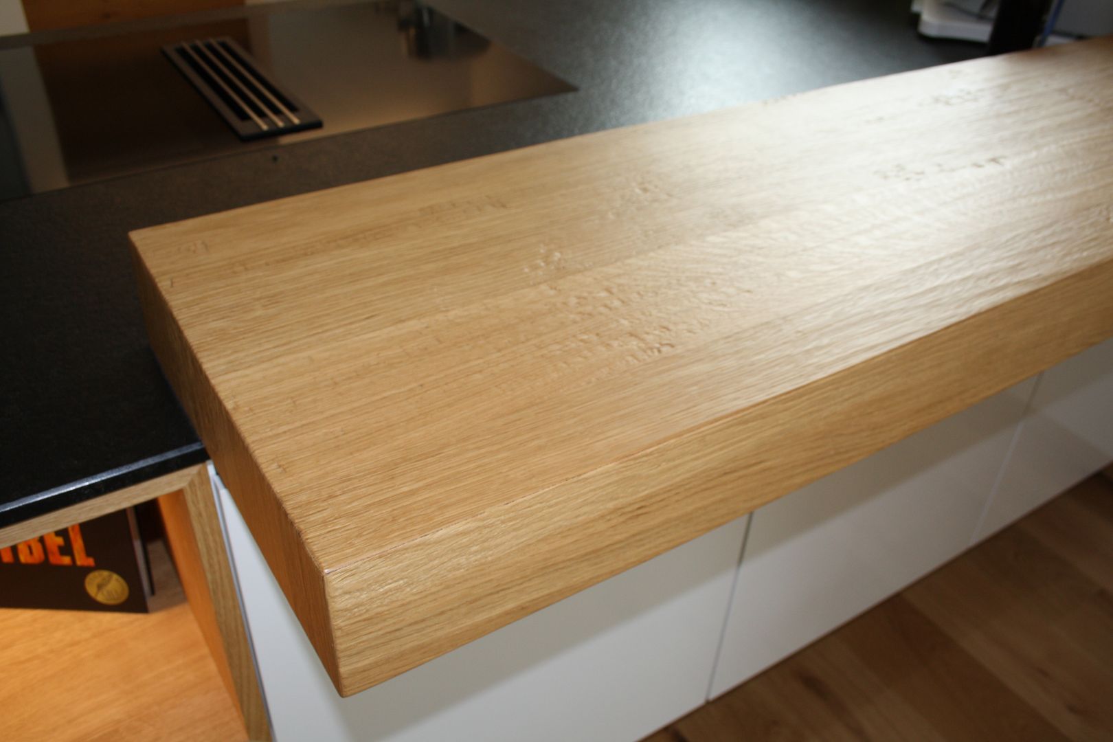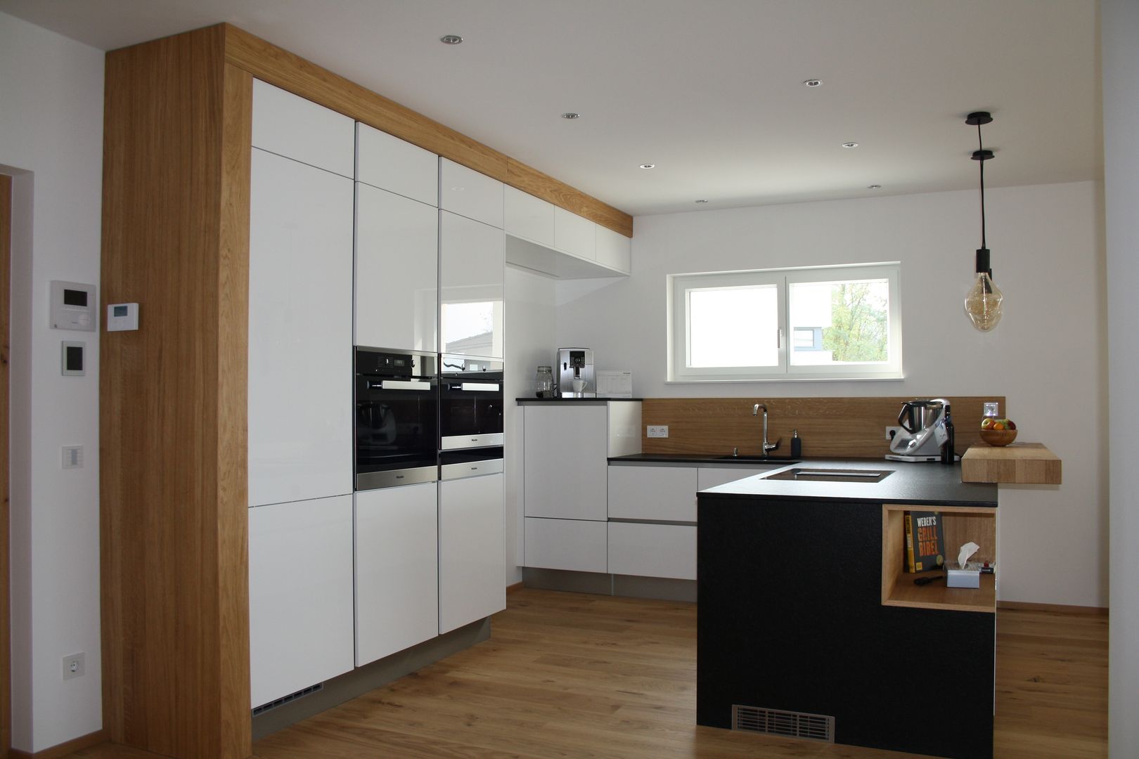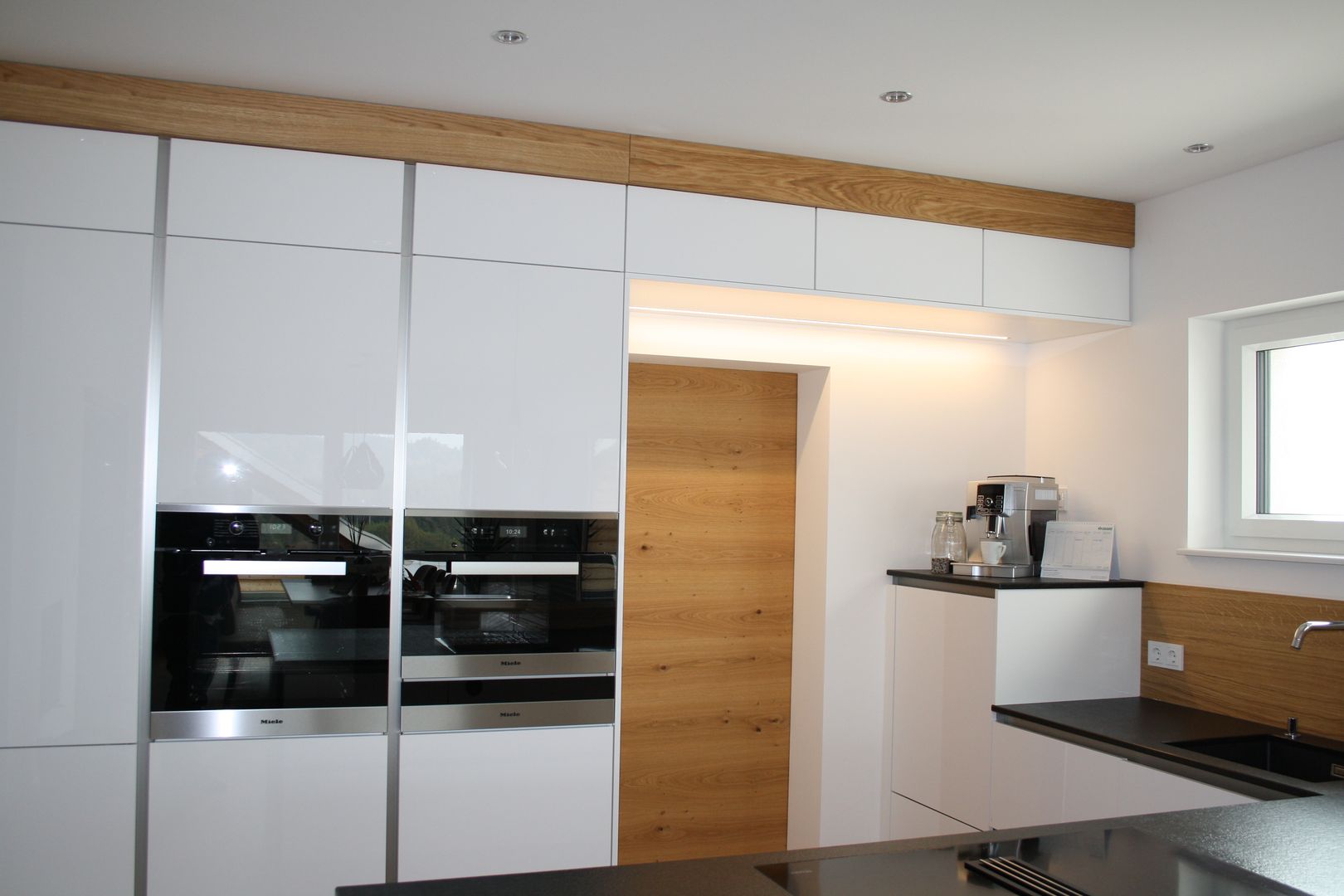 Küche - Lack Hochglanz mit Applikationen in Eiche Echtholz geschroppt und gebürstet aus unserer Werkstatt (Bartheke, Passepartout, Designregal mit LED-Beleuchtung) raumhoch verbaut, Speiseeingang optisch integriert, hochgestelltem Geschirrspüler, Naturstein-Arbeitsplatte, Natursteinwange.