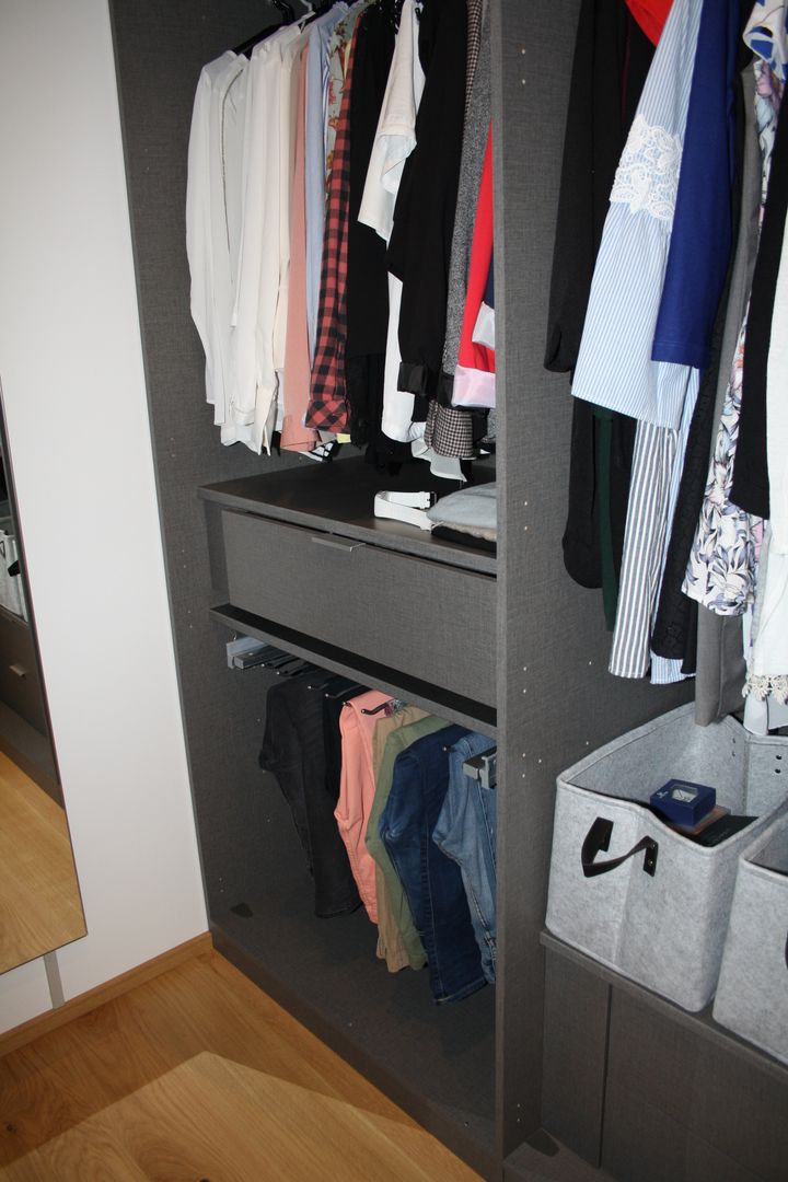 Schrankraum raumhoch in dunklem Leinendekor mit Hosenauszügen und Innenladen.