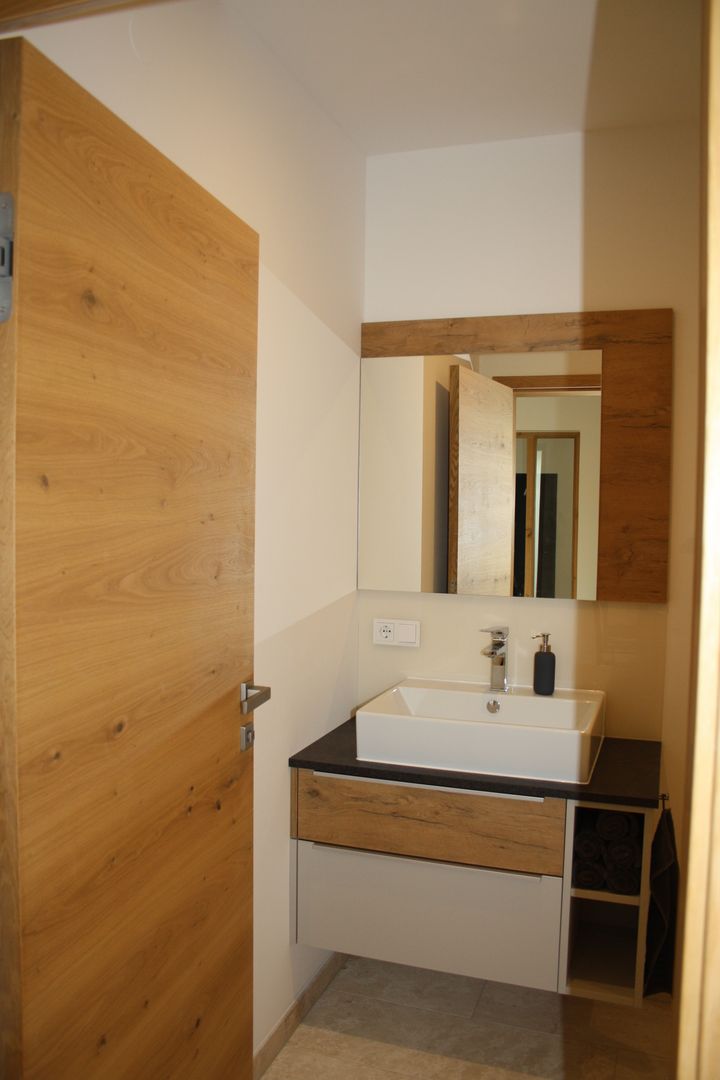 Bäder in Dekor matt (Unidekor/Holzdekor, Spiegelpaneel inkl. Beleuchtung, Schrank um Wäscheabwurf zu verstecken).