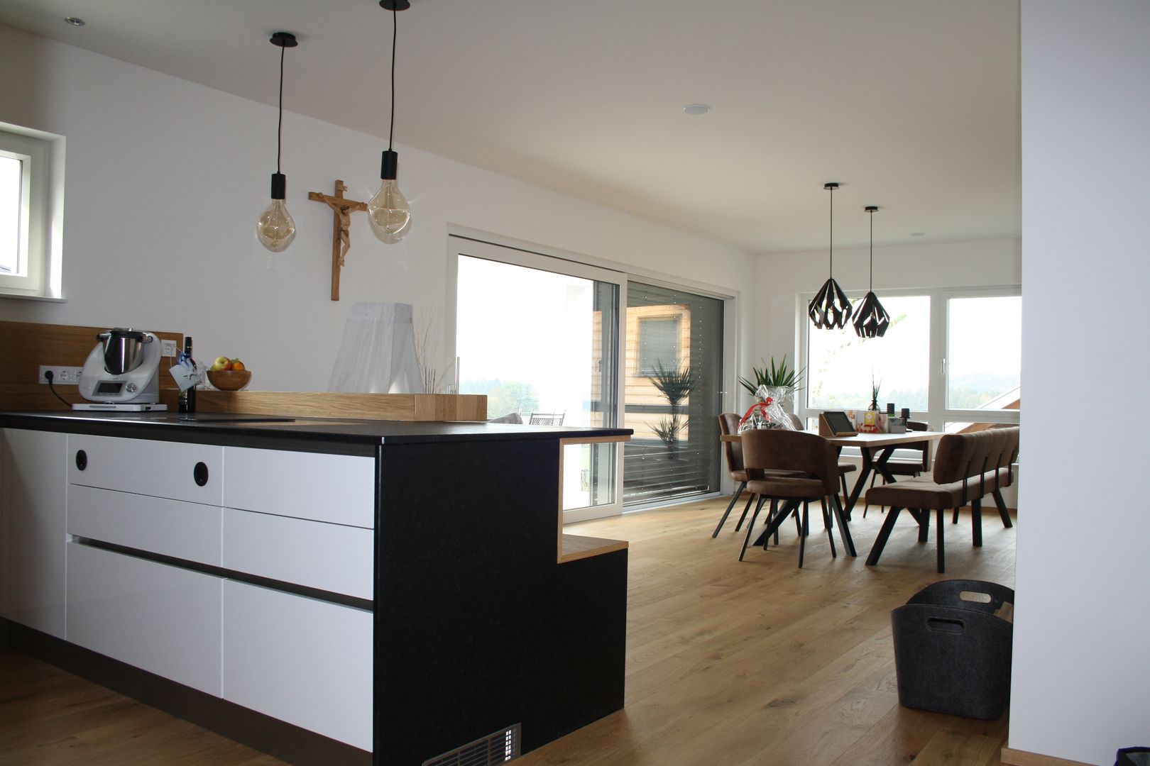 Hochglanz-Fronten kombiniert mit viel Holz und natürliche Materialien sorgen für den richtigen Wohlfühlfaktor