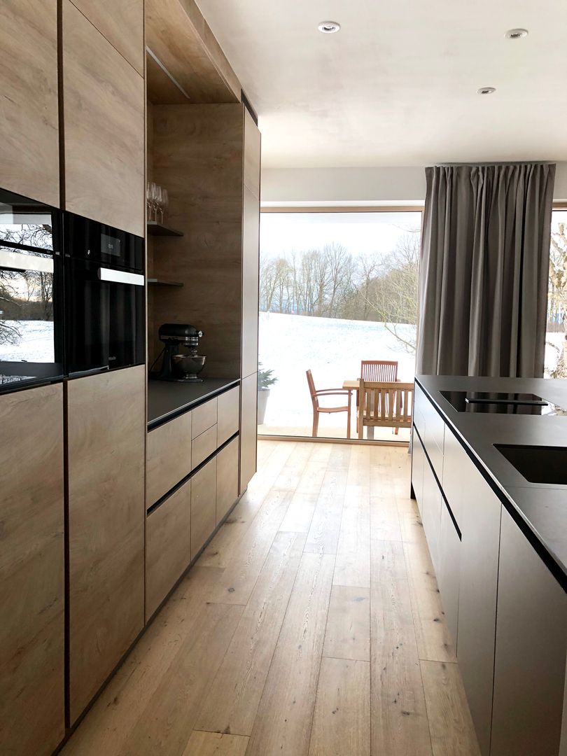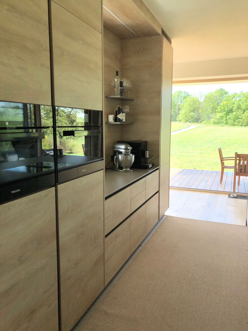 Grifflose Küche in schlammgrau und Holzoptik