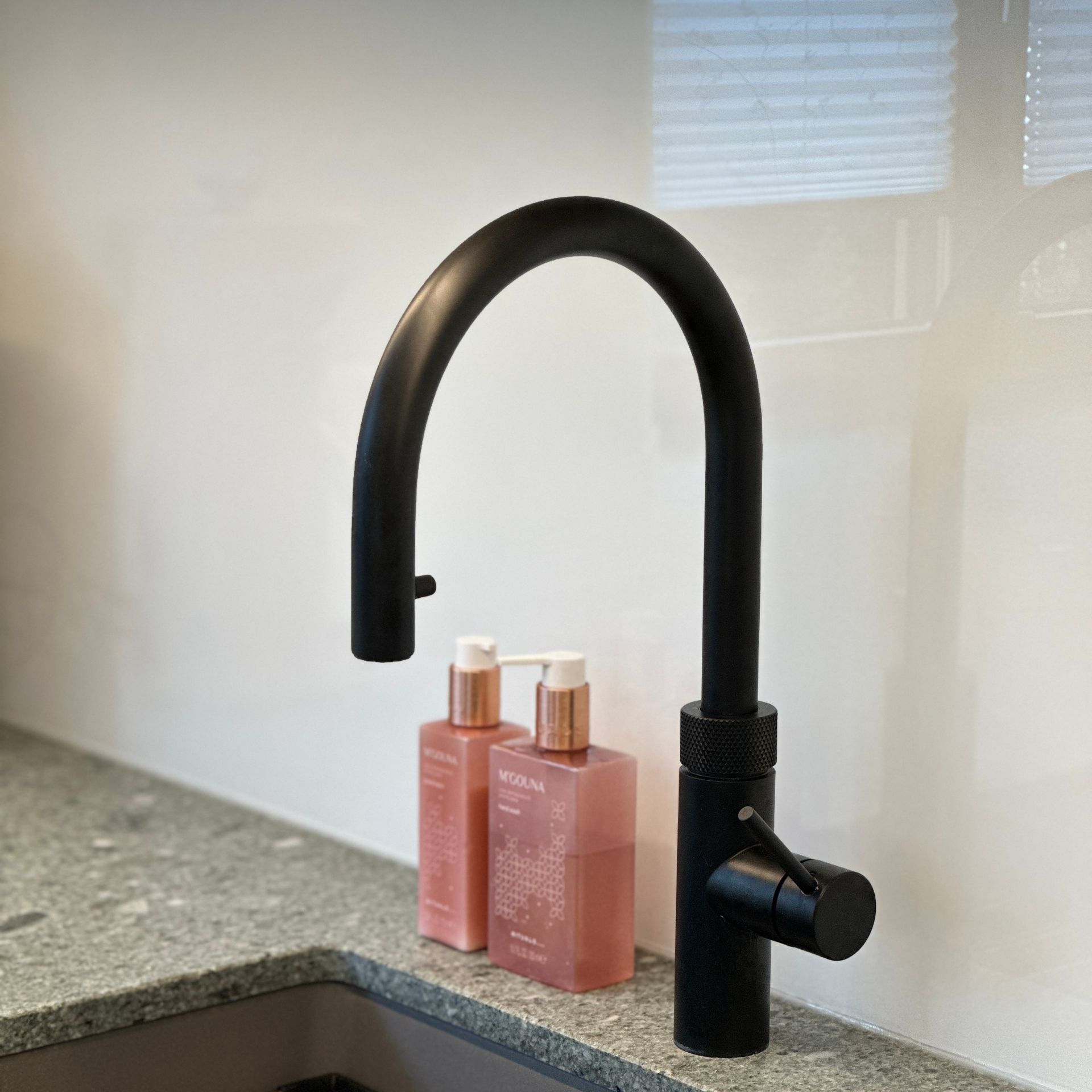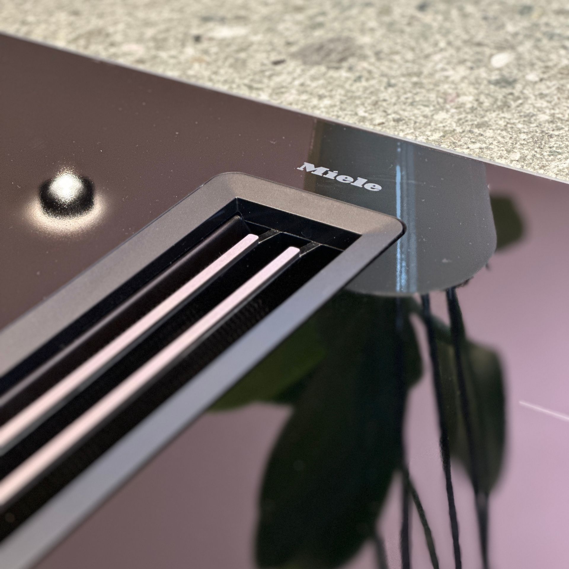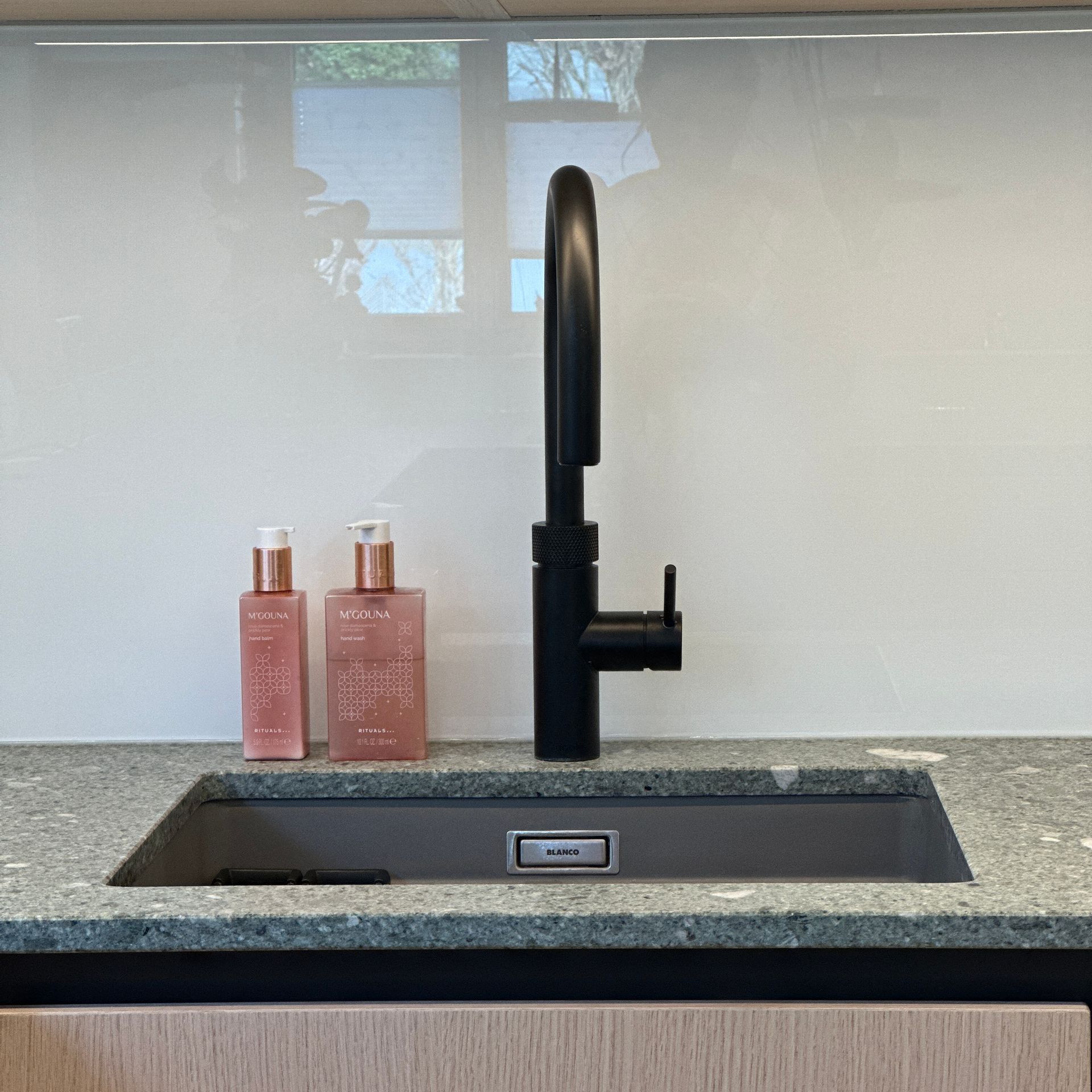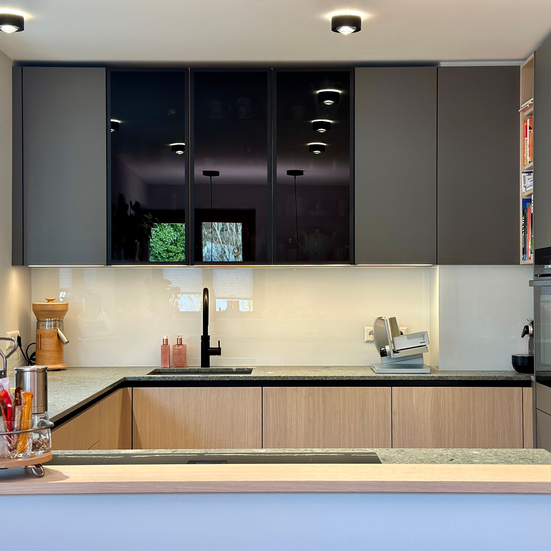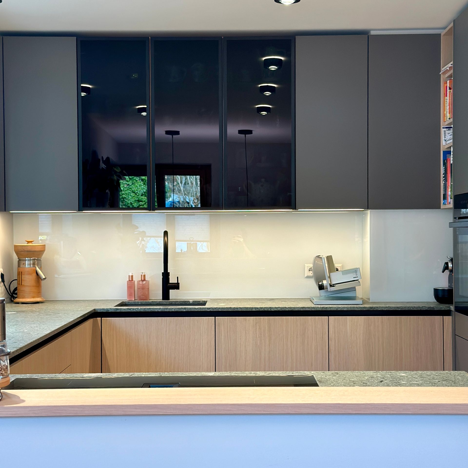 Eiche Weiß x Basaltgrau x Gletscherbach - plus Quooker & flächenbündiges Kochfeld mit integriertem Abzug.
